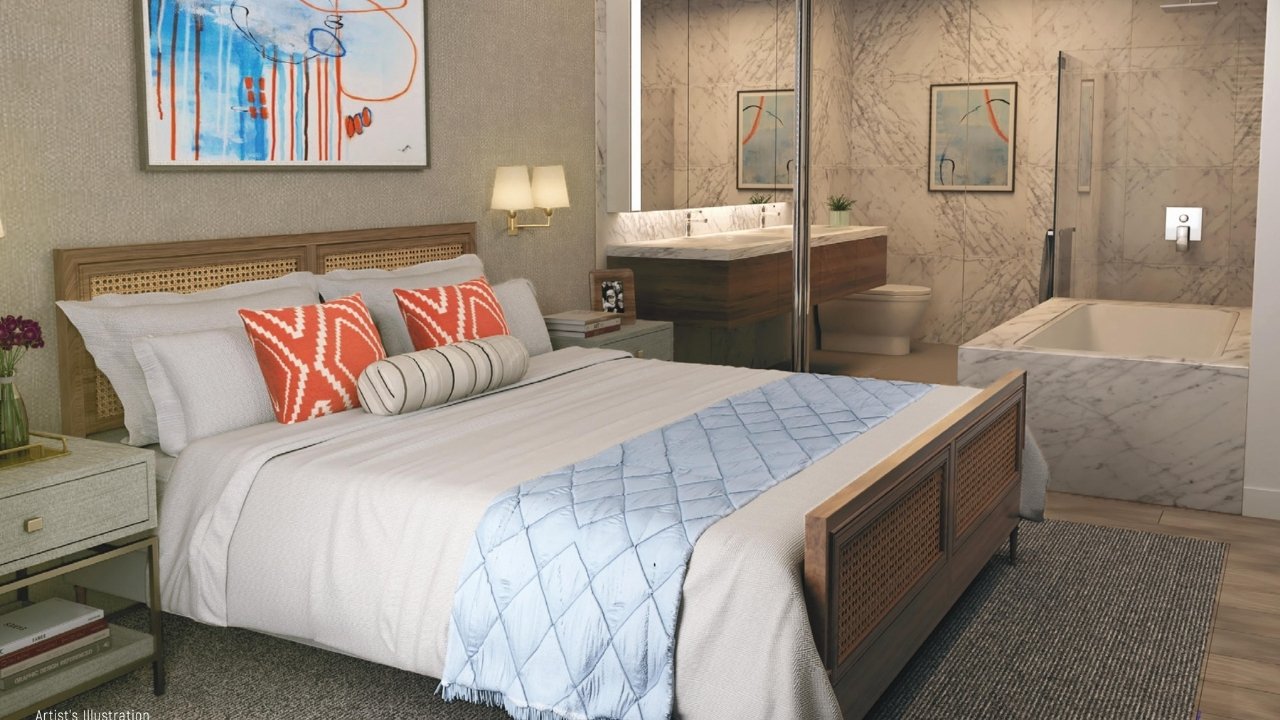 Each unit is crafted with high-quality materials and thoughtful details, including wood-like tiles in the living areas and bedrooms, and porcelain tiles in the kitchen and bathrooms. The kitchens feature laminated cabinetry and quartz countertops, while the bathrooms are adorned with natural stone countertops and elegant fixtures.