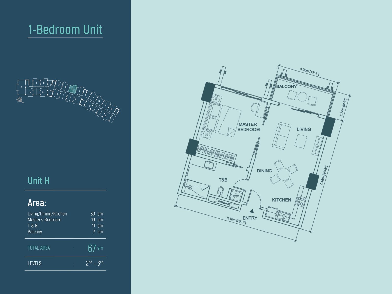 • 1-Bedroom Unit: Total Area 67 sm, located on the 2nd–3rd floors.