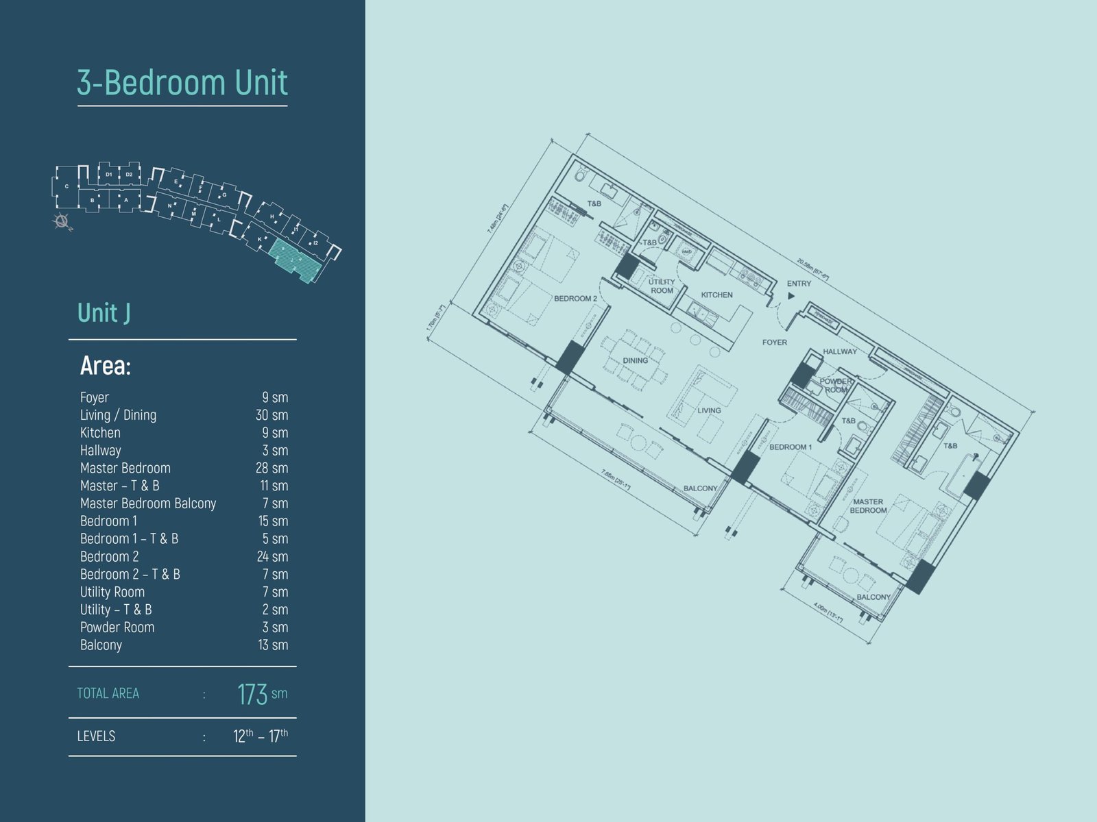 • 3-Bedroom Unit: Total Area 173 sm, located on the 12th–17th floors.