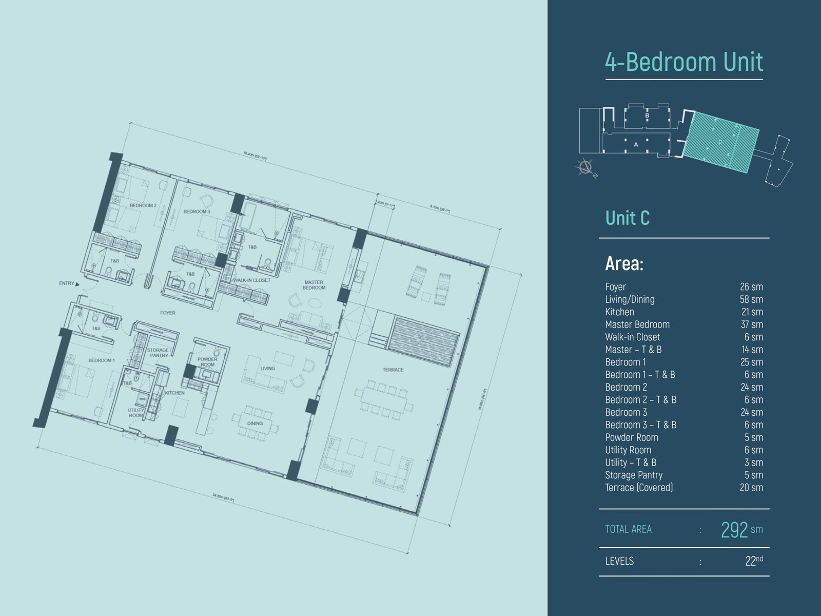 • 4-Bedroom Unit: Total Area 292 sm, located on the 22nd floor.