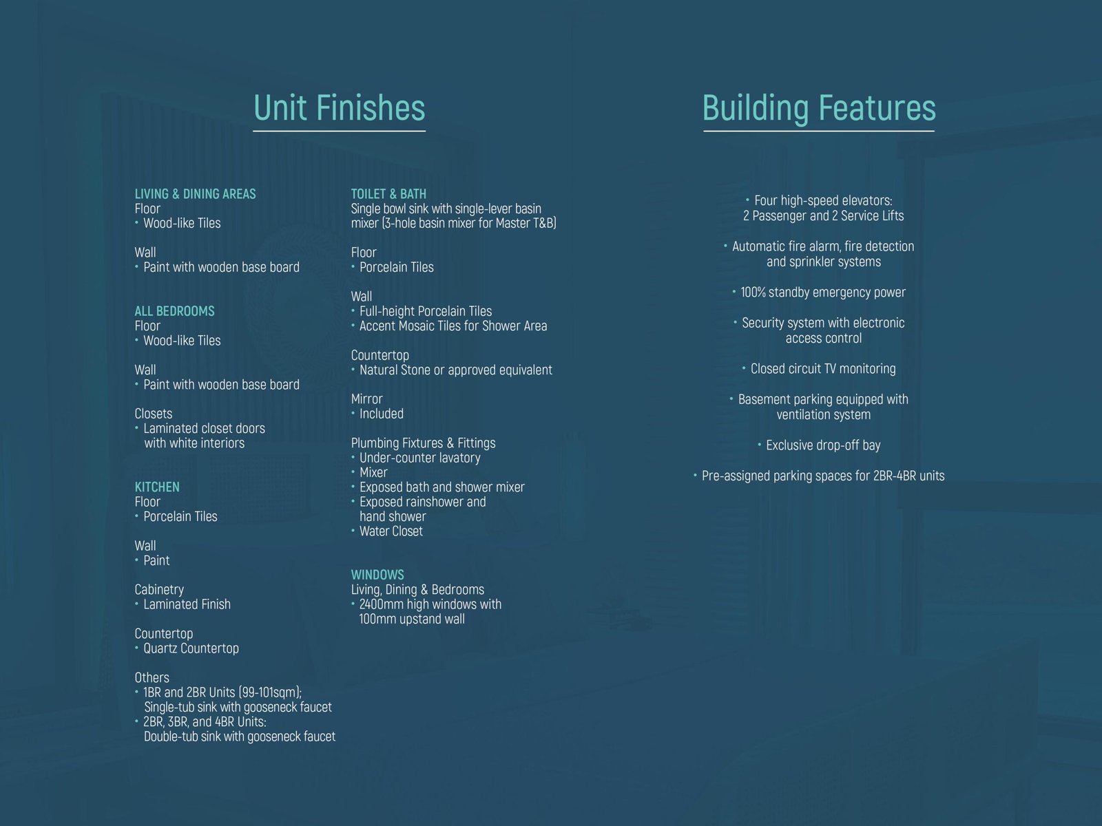 • Parking: Basement parking with a ventilation system. Pre-assigned parking spaces are available for 2- to 4-bedroom units.